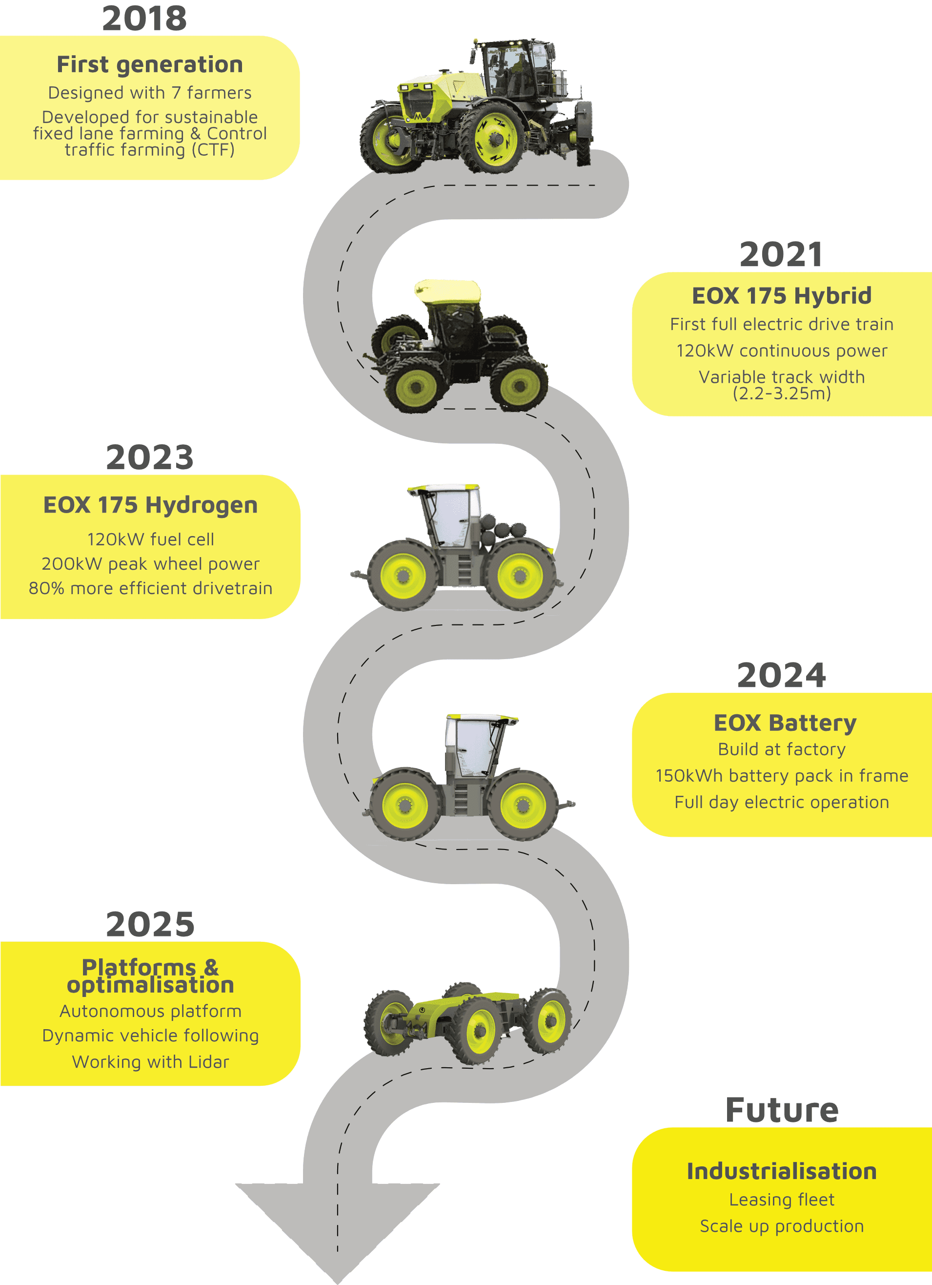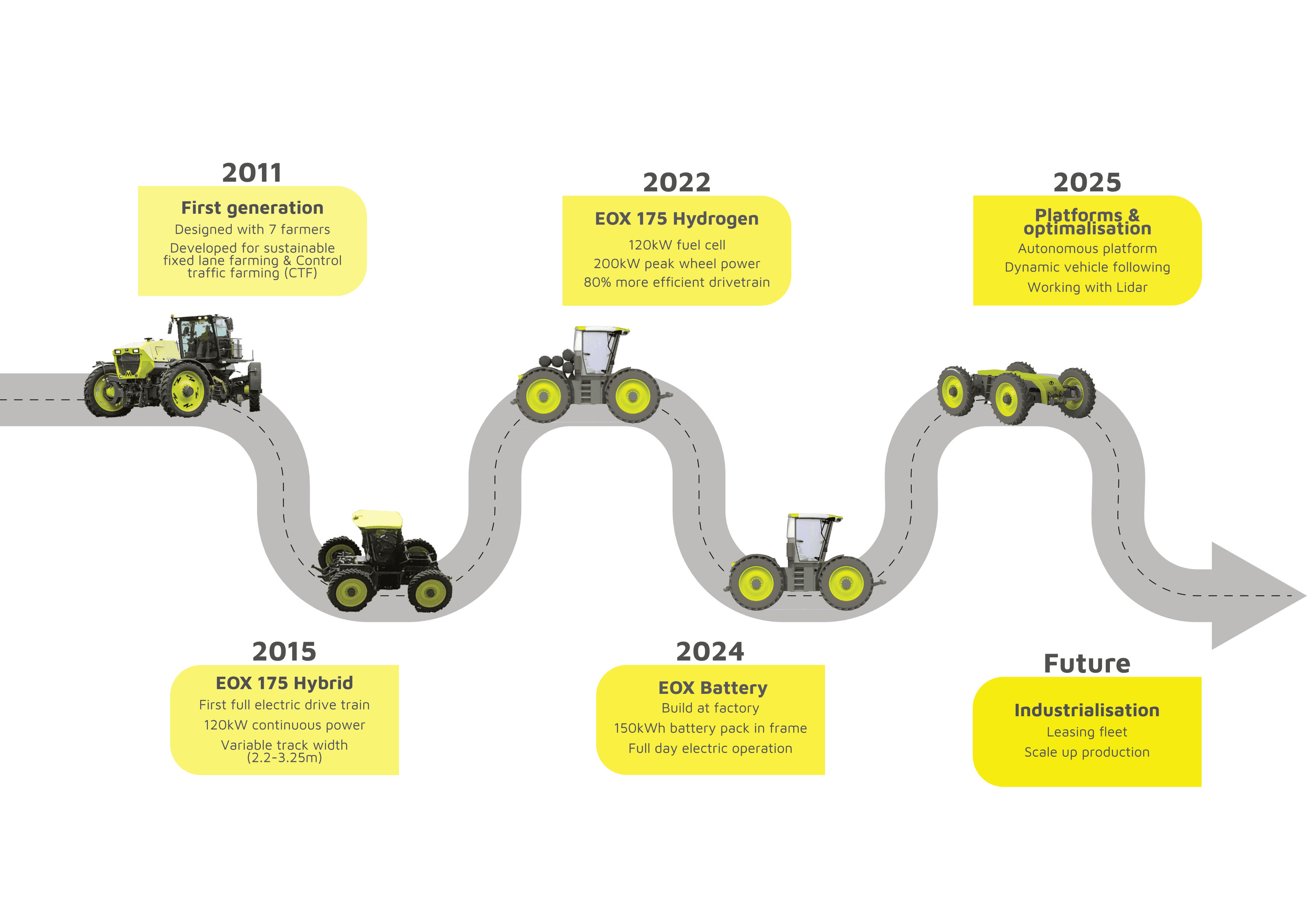 Sinds 2015 ontwikkelt EOX Tractors elektrisch aangedreven tractoren. In 2020 werd de EOX175 Hybrid geïntroduceerd, gevolgd door de EOX175 Hydrogen (waterstoftrekker) in 2022. In 2024 zijn twee EOX Frontiers (volledig elektrische platforms) geproduceerd door een gespecialiseerde machinebouwer. Deze nieuwe generatie tractoren combineert batterij-elektrische met autonome functies.